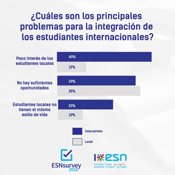 mayor proporción de respuestas, un 42,1%, corresponde a los que tienen de dos a cinco amigos de su misma nacionalidad. Por otra parte, en lo que se refiere a las barreras de integración entre los estudiantes internacionales y los estudiantes locales, la percepción de los estudiantes internacionales muestra que la principal razón de la falta de interacción es que los estudiantes locales no están interesados, seguida de la falta de oportunidades para ello y de las diferencias en los estilos de vida. Además, las tres principales razones a las que aluden los estudiantes locales para no interactuar con los estudiantes internacionales son la falta de oportunidades para ello, la falta de confianza para ello y la falta de habilidades idiomáticas. Por ello, es importante el apoyo de organizaciones como ESN para el desarrollo de un programa social de calidad para las horas que los estudiantes pasan fuera del aula. Actividades como los tándems lingüísticos o los buddy programmes, son dos claros ejemplos de cómo promocionar la integración con los miembros de la comunidad local. Una conclusión a tener en cuenta es que los estudiantes internacionales cuyas universidades de acogida ofrecen más actividades sociales, hacen más amigos dentro de todos los grupos sociales que aquellas en las que el programa social no es tan intenso, y además puntúan más alto su nivel de satisfacción general de la estancia internacional. Otra manera de promover la integración de estudiantes internacionales y estudiantes locales podría ser el apoyo a los estudiantes internacionales para encontrar alojamiento compartido con estudiantes locales para crear una integración tanto con locales como con estudiantes internacionales. De hecho, según los resultados de la ESNsurvey, los estudiantes internacionales que vivieron con estudiantes locales hicieron más amigos locales que aquellos que vivieron solos o con otros estudiantes internacionales.