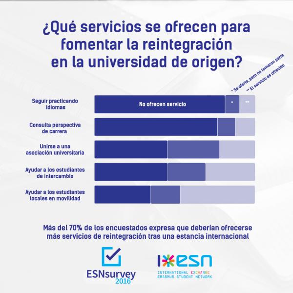 Reintegración en la universidad del país de origen y tras el periodo de movilidad (¿qué ocurre después?): Solo una pequeña parte de los encuestados afirma que su universidad de origen ofrece de manera satisfactoria algún tipo de curso para no perder las habilidades lingüísticas adquiridas durante la estancia en el extranjero, y lo mismo ocurre con la orientación sobre las perspectivas laborales que puede proporcionar el haber realizado una estancia internacional. Algo mayor es la proporción de estudiantes a los que se les ofrece adecuadamente integrarse dentro de una asociación estudiantil (menos del 20%) y ayudar a los estudiantes internacionales que vengan a la institución (menos del 30%). Por último, algo menos del 50% de los encuestados afirmó que se les ofreció satisfactoriamente la posibilidad de ayudar a los estudiantes locales que iban a realizar próximamente una estancia internacional. Así pues, y la luz de los resultados obtenidos en la ESNsurvey aún queda mucho por hacer en este campo, puesto que más del 70% de los encuestados expresó que deberían ofrecerse servicios de reintegración tras una estancia internacional. Otro dato importante es que, a raíz de su estancia internacional, el 93% de los antiguos estudiantes internacionales encuestados afirmó que se podría estar interesado en migrar al extranjero para trabajar en un futuro, mientras que el 86% de los estudiantes que aún no han realizado una estancia en el extranjero se mostraría dispuesto a hacerlo.