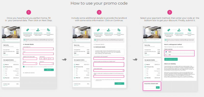 - Rellena todos los datos en el Formulario de Reserva e introduce el código promocional en la página de pago (paso 3) para obtener un descuento en el precio de la reserva. El dinero sólo se cargará en tu cuenta cuando el propietario acepte tu reserva.